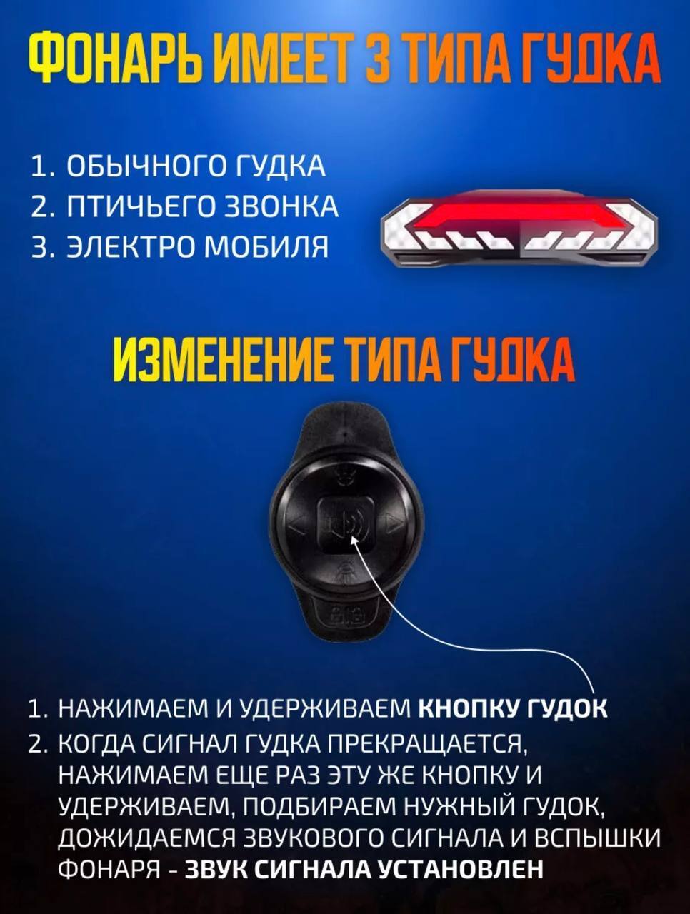 Аккумулятор. Мощный аккумулятор обеспечивает длительное время работы задней фары стоп сигнала, позволяя вам оставаться видимым даже в условиях недостаточного освещения.